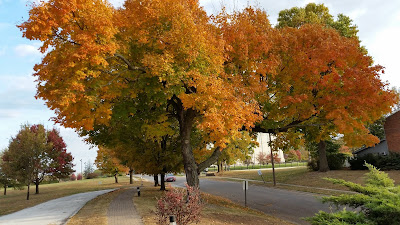 The autumn leaves looking from our porch toward the temple. The leaves are starting to be beautiful, even though, many have fallen without color.